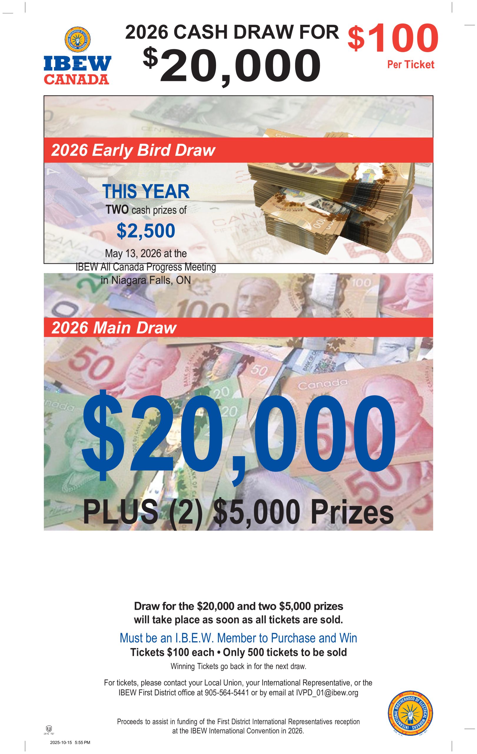 IBEW $20,000 Cash Draw 2026 To purchase tickets, please visit us at our office on 2460 Lancaster Rd, Suite 103.